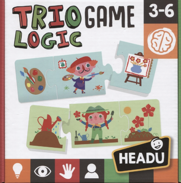 Trio logic game é um jogo acomodado em caixa, 36 peças, com uma ligação auto-correctiva, permite associar cada profissão ou ocupação aos instrumentos correctos, dos 3 a 6 anos