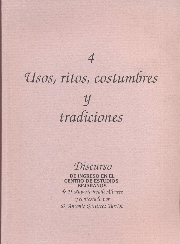Usos, ritos, costumbres y tradicciones : discurso [de ingreso en el Centro de Estudios Bejaranos] / de D. Ruperto Fraile Álvarez y contestado por D. Antonio Gutiérrez Turrión Publicação: Béjar : 1993, Centro de Estudios Bejaranos y AyuntamientoDescrição: 73 p. ;