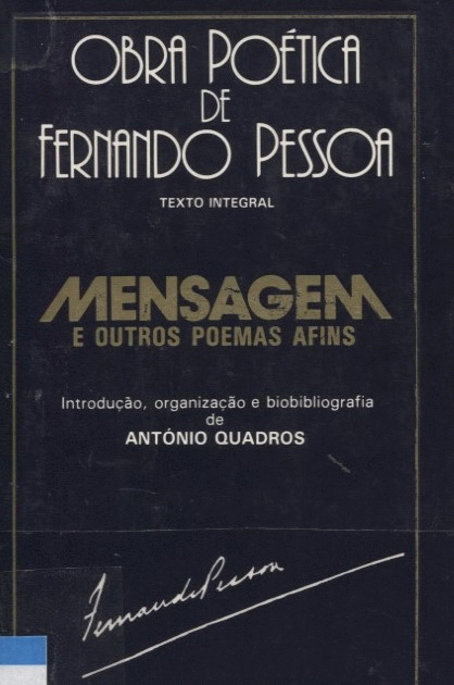 Mensagem e outros poemas afins / Fernando Pessoa ; introdução ; organização e biobibliografia de António Quadros seguidos de Fernando Pessoa e a ideia de Portugal : as raízes e os fundamentos teóricos da poética de “Mensagem” e dos poemas afins, em textos seleccionados do próprio poeta / Fernando Pessoa ; introdução ; organização e biobibliografia de António Quadros Publicação: Mem Martins : [198-?], Europa-AméricaDescrição: 198, [2] p. ;