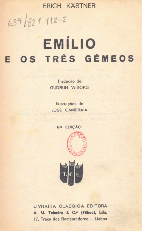 Emílio e os três gémeos / Erich Kastner ; trad. Gudrun Wiborg ; il. de José Cambraia Publicação: Lisboa : 1970, Livraria ClássicaDescrição: 220, [1] p. :