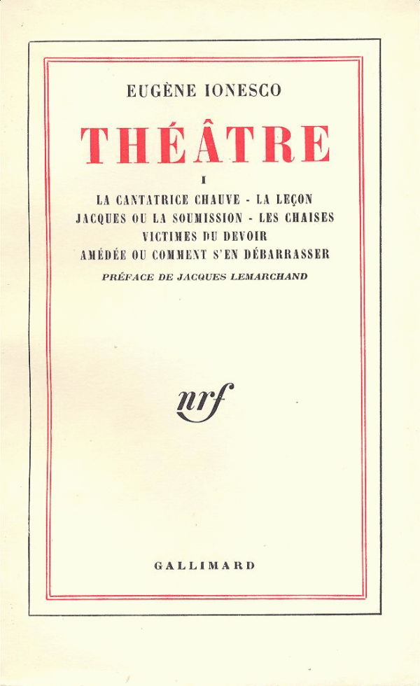 Théâtre : la cantatrice chauve, la leçon Jacques ou la soumission, ... / Eugène Ionesco Publicação: Paris : [1954], GallimardDescrição: 323, [6] p. ;