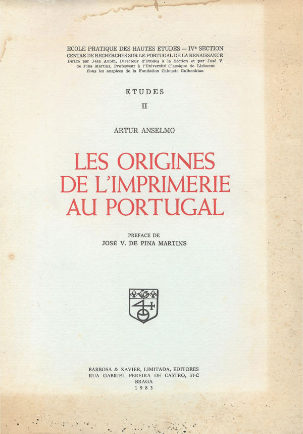 Les origines de l'imprimerie au Portugal / Artur Anselmo ; preface de José V. de Pina Martins Publicação: Braga : 1983, Barbosa & XavierDescrição: 597, [2] p. ;