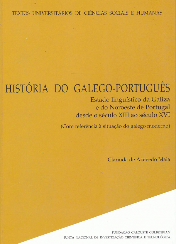 História do galego-português : estado linguístico da Galiza e do Noroeste de Portugal desde o século XIII ao século XVI : (com referência à situação do galego moderno) / Clarinda de Azevedo Maia Publicação: [Lisboa]: Fundação Calouste Gulbenkian: Junta Nacional de Investigação Científica e Tecnológica : D.L. 1997Descrição: XV, 1007, [1] p., [5] p. il. :